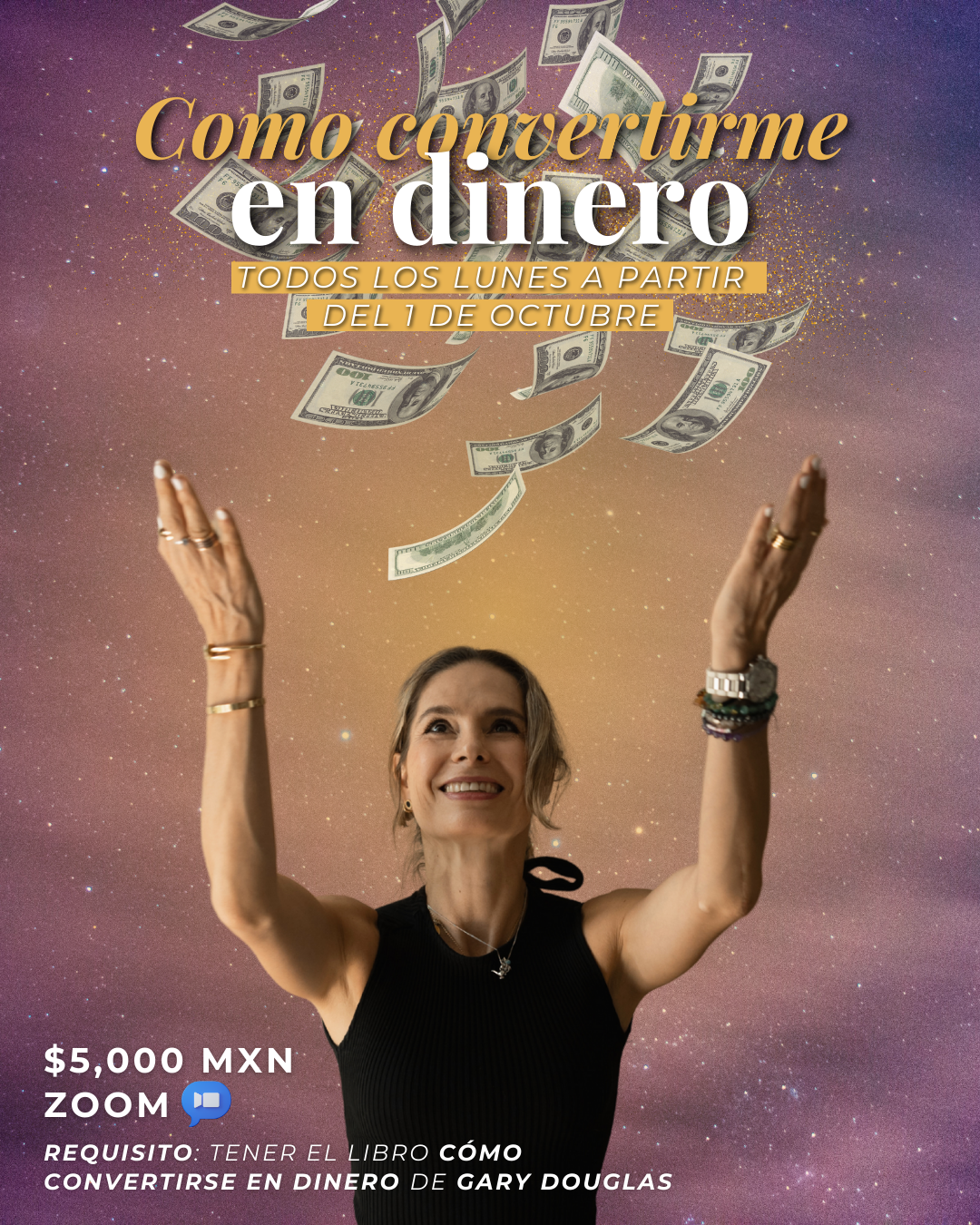 10 sesiones donde estaremos destruyendo y descreando la relación con el dinero que has creado hasta ahorita (todo lo que aprendiste, todos los puntos de vista que te impiden actualizar más gozo, diversión y facilidad con el dinero).